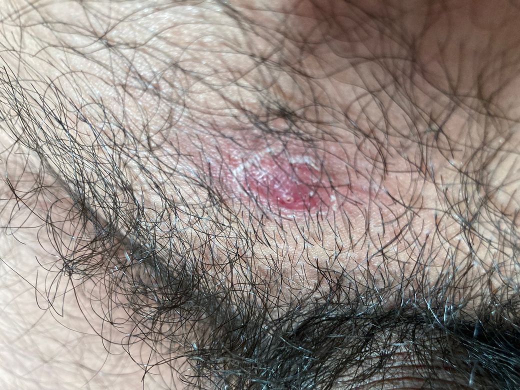 성기 윗 부분 종기가 났습니다 처음에는 그냥 빨간 혹 같은 느낌으로 만지면 아프고 안만지면 느낌은 없었습니다 사진은 5일정도 지났을때 입니다 성관계는 매주 여자친구랑만 합니다