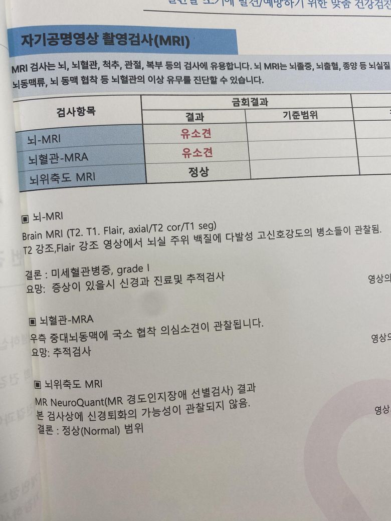 건강검진 결과 머리쪽 MRI MRA 검사결과에 유소견이고 내용이 이렇습니다. 심각한건가요?