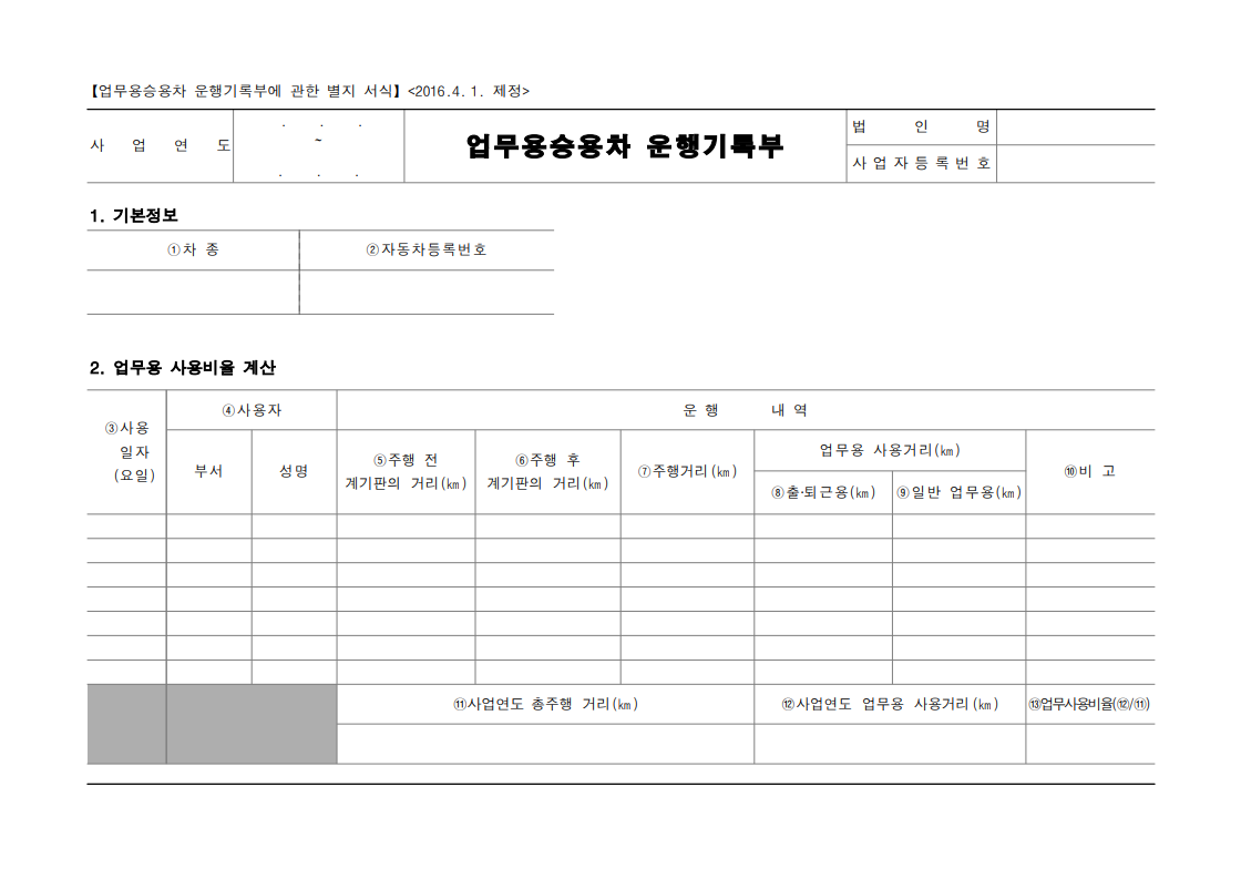 차량번호 , 차종, 일자, 주행거리, 운행목적, 운전자, 운행비용 등이 기재되어있으면 되는 것입니다.