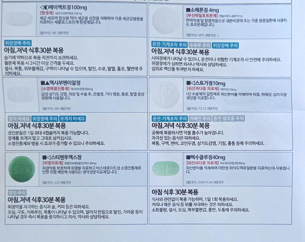사진상 약 구성을 보면 항생제(에이엔트정), 스테로이드(스테로이드정 4mg), 위산억제제/위장약(스토가정, 페녹스라졸), 위점막보호제(수테온), 소염진통제 계열(에소니드파인정으로 보이는 진통·소염제)이 포함되어 있습니다.