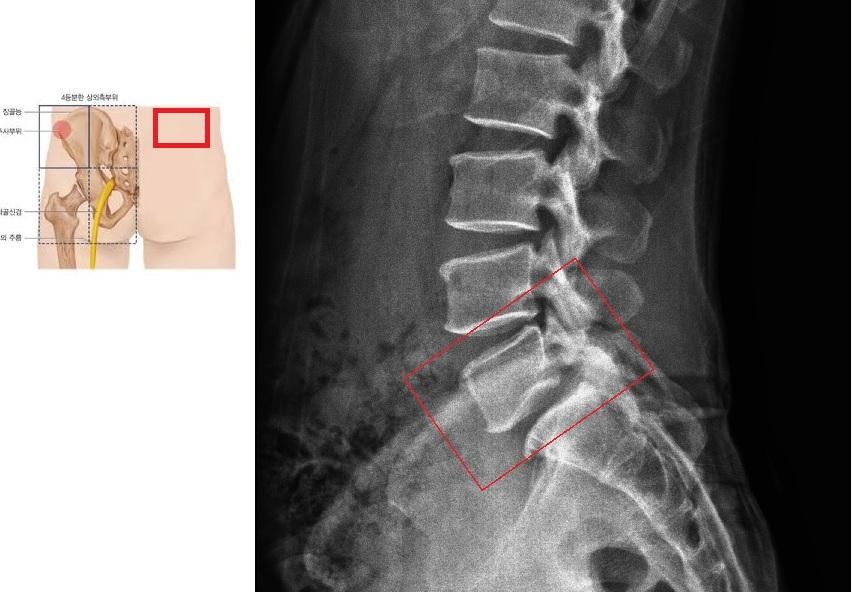 통증 발생 후 현재까지 10일 가량 계단/언덕 오르기 운동을 멈추고 진통제를 먹어도 나아지는 게 없어 정형외과에서 진료를 받았는데 x레이를 찍어보니 S1과 L5 사이에 협착 의심 소견 (x레이 사진) 외에 별 다른 말은 없었습니다.