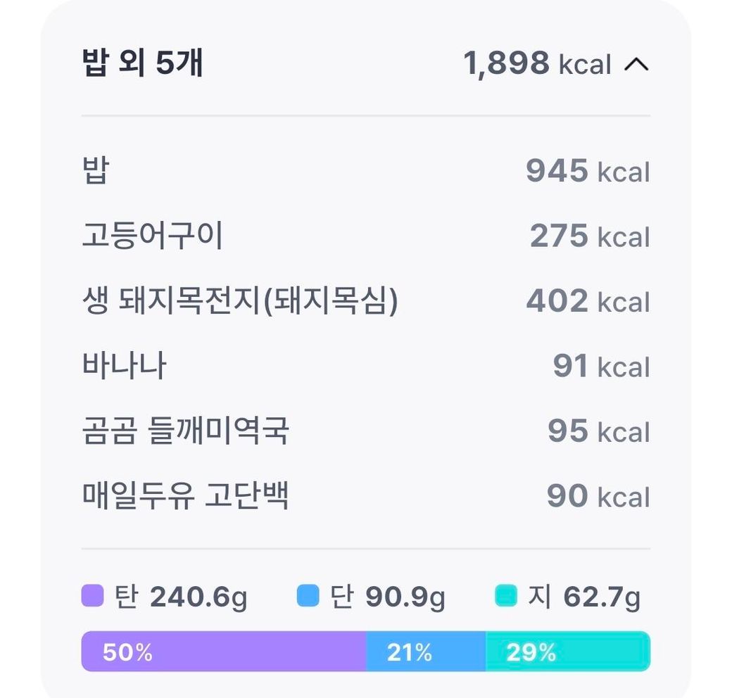 쌀 단백질(15g): 쌀 단백질은 필수 아미노산인 '라이신'이 부족한 불완전 단백질이나, 함께 드시는 고등어, 돼지목전지(동물성 단백질)가 이를 완벽하게 보완(아미노산 상호보완 작용) 해줍니다. 따라서 쌀로 채우는 15g도 근육 합성에 충분히 기여하니 염려하지 않으셔도 되겠습니다.