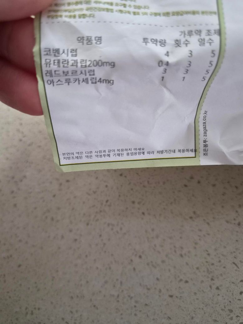 걱정하실 부분이 하나도 없습니다. 사진의 처방은 코감기/상기도 감염에서 흔히 사용하는 조합으로 보이며, 해열제는 별도로 필요 시 사용하는 방식은 적절합니다. 현재 상황에서 보호자 입안의 커피 성분이나 음식물이 아이에게 영향을 줄 가능성은 매우 낮습니다. 일시적으로 입술이 닿는 정도로 약물이나 카페인이 의미 있게 전달되는 수준은 아닙니다.