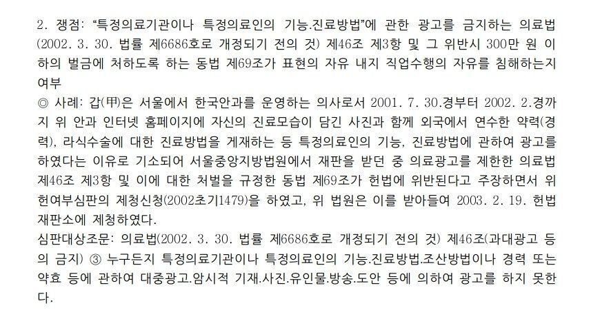 또한 의료법(2002. 3. 30. 법률 제6686호로 개정되기 전의 것) 제46조 제3항 중 “특정의료기관이나 특정의료인의 기능ㆍ진료방법”에 관한 광고금지 및 제69조 중 동 광고금지 위반 부분(이하 이들을 ‘이 사건 조항’이라 한다)이 아니더라도 의료법 제46조 제1항, 표시ㆍ광고의공정화에관한법률, 소비자보호법, 독점규제및공정거래에관한법률, 옥외광고물등관리법 등에 의하여 “의료인의 기능이나 진료방법”에 관한 허위ㆍ기만ㆍ과장광고를 통제할 수 있다.