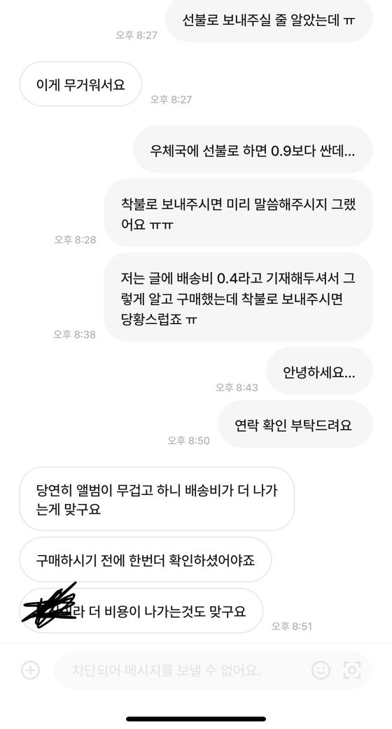 그래서 택배를 왜 아무 언질 없이 착불로 보냈냐 물으니 물어보지 않은 구매자 잘못이라며 차단을 하셨습니다.