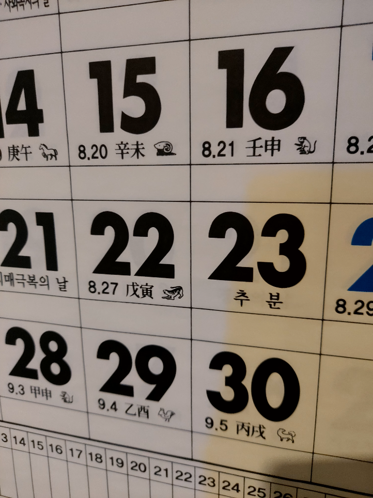 자축인묘진사오미신유술해 - 지지 (흔히 띠라고 함) 을 모두 대치시키면 60개가 나옵니다. 그래서 한 바퀴가 돌면 환갑이라고 합니다. 이것을 매일매일 나타낸 글자와 그림이 달력에서 보는 내용입니다.