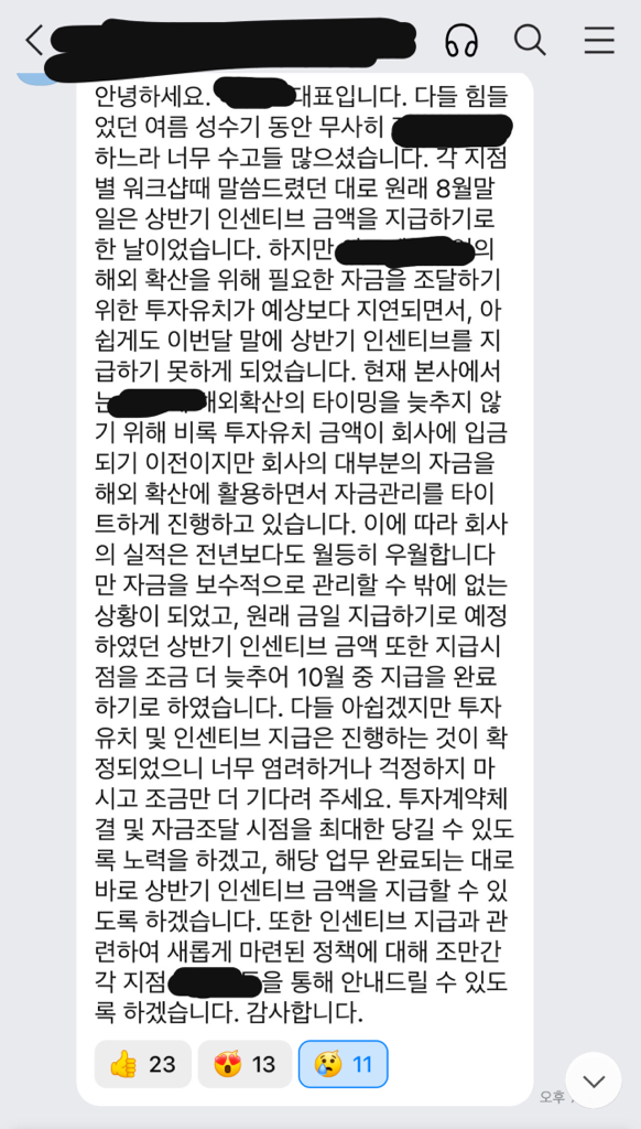 저희 회사는 입사당시 오리엔테이션때 매년 상반기,하반기 성과금 지원을 약속하였습니다. 하지만 계약서 상엔 작성이 되지않았고, 지급이 4개월 밀렸지만 언제 지급이 될지 또는 이유가 무엇인지 정확한 얘기도 못듣고 있습니다 저희가 인센티브를 받는다는 증거로는 8월 상반기에 지급을 못해서 10월중 지급을 완료한다는 대표의 전체사과 메신저 증거가 있고 또 한번 기다렸지만 10월이 지난 지금까지 이유도 모른채 기다리고만 있습니다
