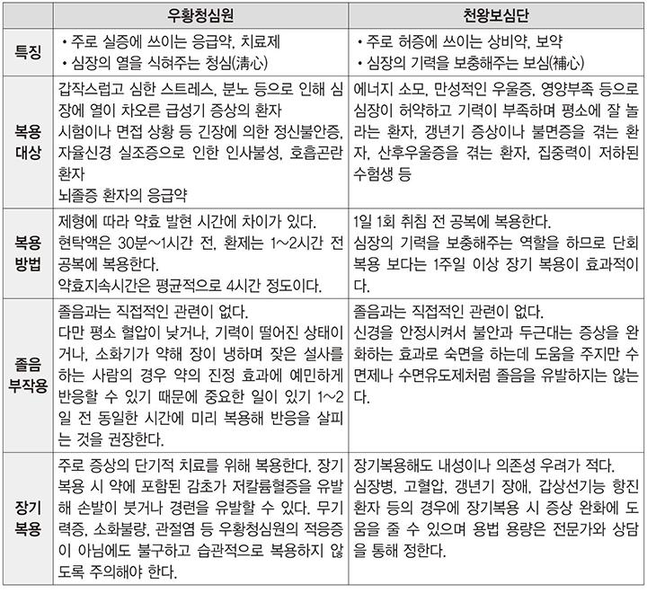 두 제품의 차이는 구체적으로는 아래와 같습니다. 목적은 둘 다 신경을 릴렉스하기 위해서 사용되는 것으로 맥락이 비슷하지만, 청심원의 경우 평소 기가 센 분들이 복용하기에 적합하고 그렇지 않은 분들은 우황청심원이 과도한 나른함을 줄 수 있기에 천왕보심단을 사용하는 것이 권장됩니다.