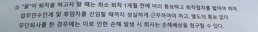 2. 또한 1개월전 미리 통보 하라는데 통보안하고 사직서를 쓸 생각입니다. 그렇다면 손해 배상 청구 대상이 되나요?