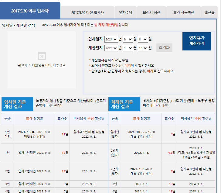 일단 2021년 9월에 입사하여 2024년 1월 15일에 퇴사하는 경우 재직기간 중 발생한 총 연차는 41개 입니다.