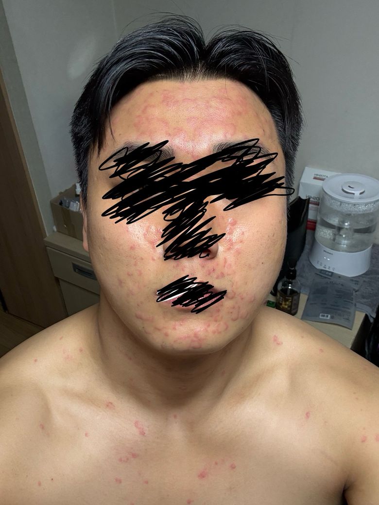 사진과 경과를 종합하면 급성 약물 유발 두드러기 또는 약물 발진 가능성이 가장 높습니다. 시간적으로 복용 후 수시간 이내에 얼굴과 몸에 동시에 발생했고, 팽진성 홍반이 다발성으로 나타난 점이 전형적입니다.