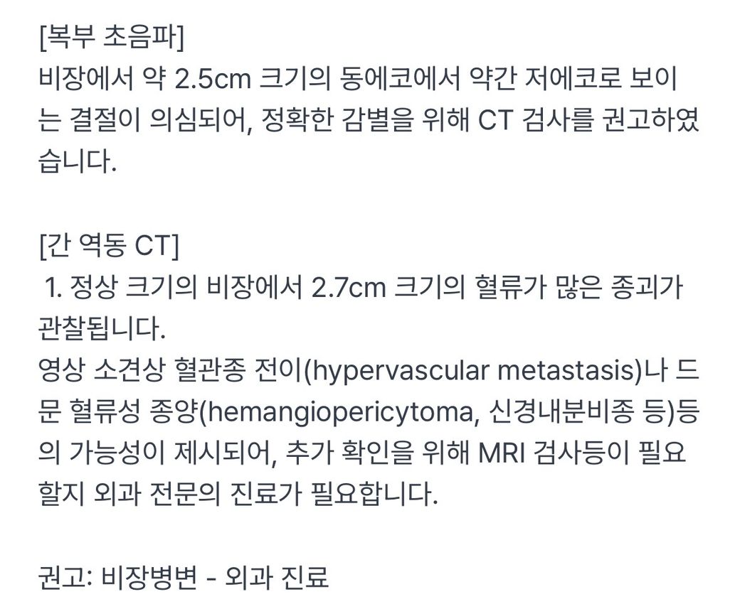 이후 바로 외과진료에서는 선생님이 ’조영제를 넣기전엔 저음영으로 보이는데, 넣자마자 많이 밝아지고 또 빠르게 빠진다(?) 혈류가 굉장히 빠르다(?)