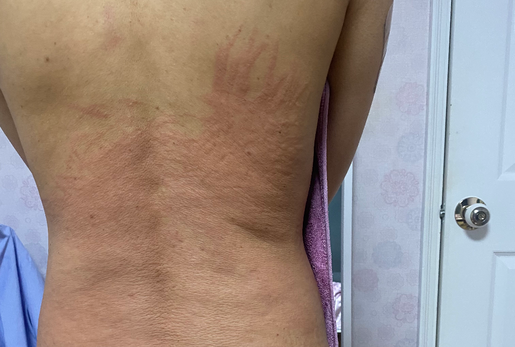 사진은 붓기 초기와 현재 손 사진과 등 피부 발진