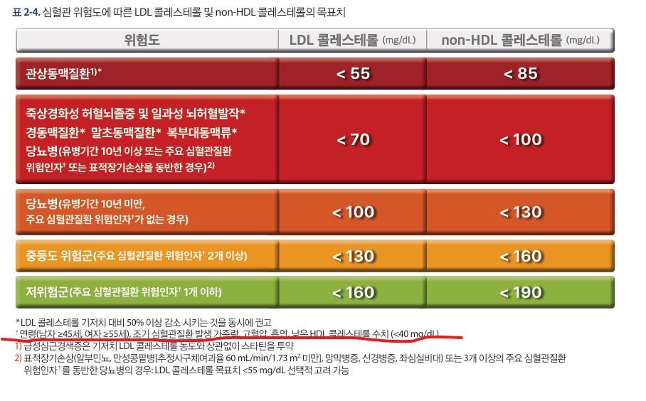 이상지질혈증 진료지침을 보면 위와 같은 표가 있습니다.