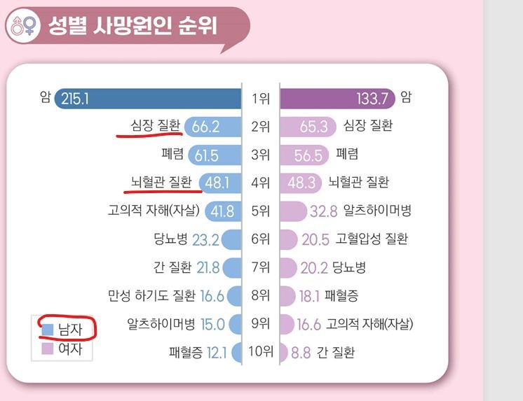 심장질환와 뇌혈관질환, 그러니까 소위 말하는 심뇌혈관질환의 사망률이 상위권에 자리한 것을 알 수 있습니다