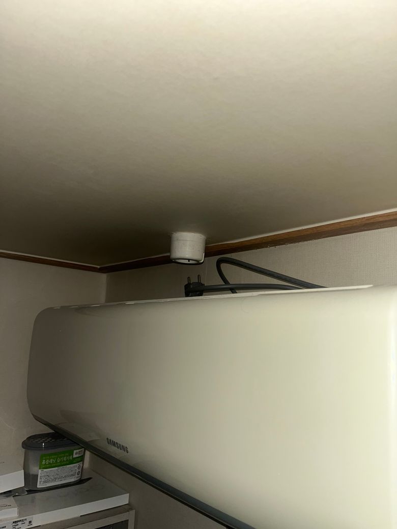 안녕하세요. 지금 제가 원룸에 거주하고 있는데 옵션으로 에어컨이 설치가 되어있어요. 아래 사진처럼 천장에 콘센트가 하나 나와있고 거기에 에어컨 전원 플러그를 연결해서 사용할 수 있게 되어있는데, 조금 전에 전원선이 꽂힌 상태에서 지지직 하는