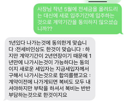 부담이 됨에도 불구하고 1년 만에 나간다는 합의에 따라 전세금을 올려서 잔금을 치뤄 주었습니다.(작년 7월)