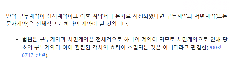 제가 좀 찾아보니까 구두(문자)계약과 문서계약이 있다면 이것을 하나의 계약으로 본다고 되어 있습니다.