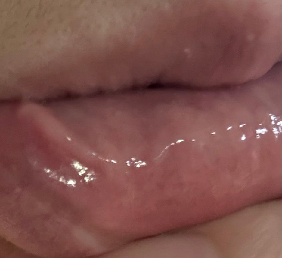 아랫입술을 까보면 한쪽만 약간 하얗게 튀어나온 부분이 있는데 뭔가요? 통증도 없고 아무느낌은 없는데 왼쪽보다 오른쪽부분이 더 튀어나와있어요 무슨문제있는건가요?