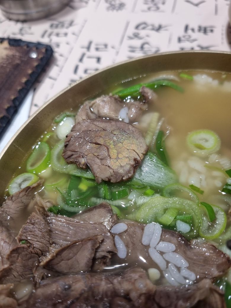 음식점에서 곰탕을 주문했는데 곰탕에 고기가 사진처럼 반짝이는 이유가 뭘까요? 조명이나 빛 반사라고 하기엔 다른 것들은 반짝임이 없습니다.