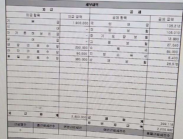 질문주신 내용과 임금명세서 내용을 보니 맞지 않는 내용들이 있는 것 같습니다.