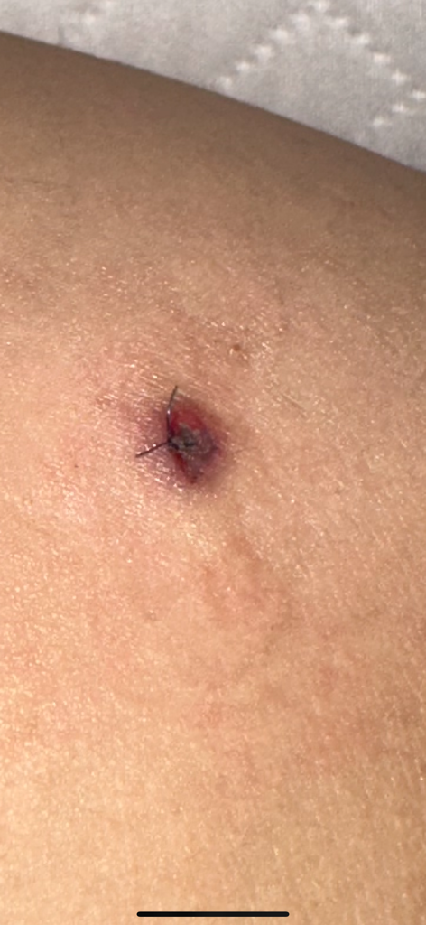 상처가 완전히 아물지는 않는 것으로 보입니다. 봉합을 조금 더 유지할지, 스테리스트립 같은 제형으로 바꿀지 드레싱하며 경과 보시면서 적절한 처치가 있을 것으로 보입니다. 답변이 도움되었으면 합니다.