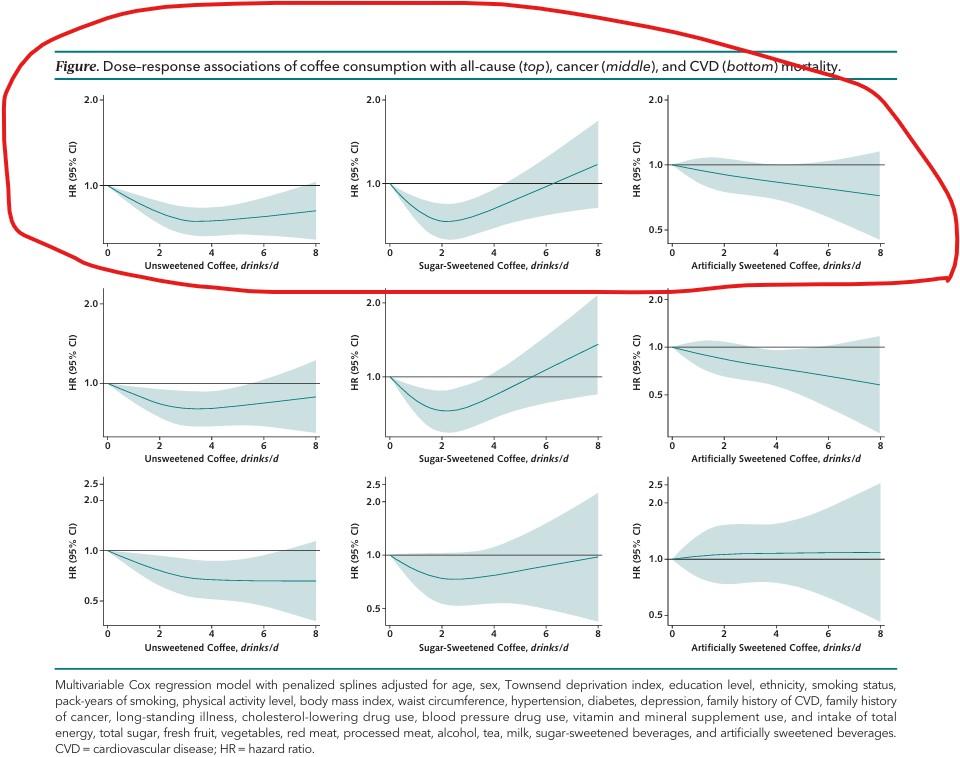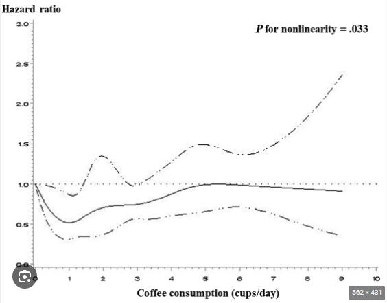 하루 3컵 정도까지는 mortality가 1보다 작으며 (그러니까 건강에 좋거나 해가 없으며) 그 이상인 경우에는