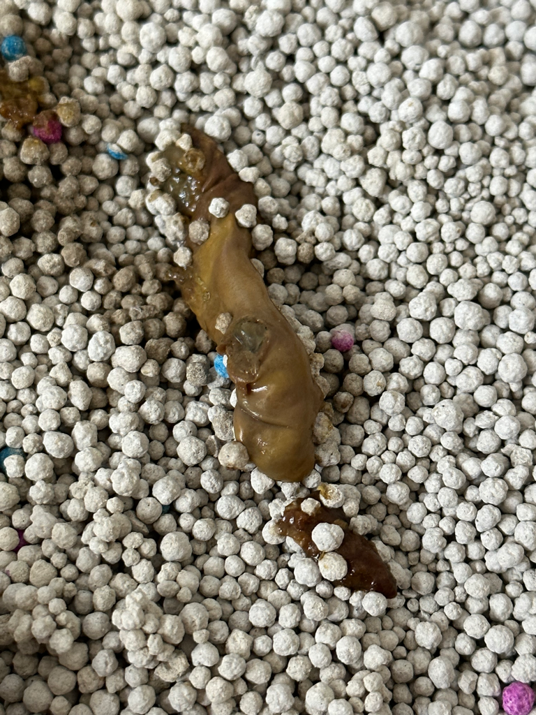 새끼고양이 3주차이구 앞니랑 송곳니가 조금씩 나기 시작했습니다. 2일전에 변비가 걸려서 식욕이 없길래 동물병원가서 생리식염수로 관장을 시키고 집에 오니 밥을 잘 안먹어요. 분유는 4시간에 한번씩 급여를 하는데 겨우 10ml도 억지로 먹는 정도이고 이유식을 먹을까하고 줘보면 3ml 주사기로 거의 강제급여식으로 3번정도 받아먹습니다... 계속 잠만 자려해요 어제부터 이유식 첫 급여했고 오늘 아침에 변 상태인데 응가에 뭐가 코팅 된듯하게 나왔는데 저렇게 변을 본적이 처음이라 혹시 애가 상태가 안좋은가요ㅠㅠ