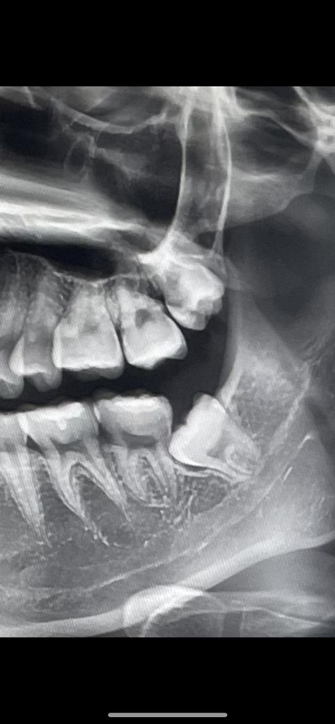 사랑니 머리 부분에 아무것도 잇는 상태가 아닙니다. 그냥 잇몸이 덮혀 있는거 같습니다. 사랑니앞치아가 썩엇을 가능성이 있어 보입니다.