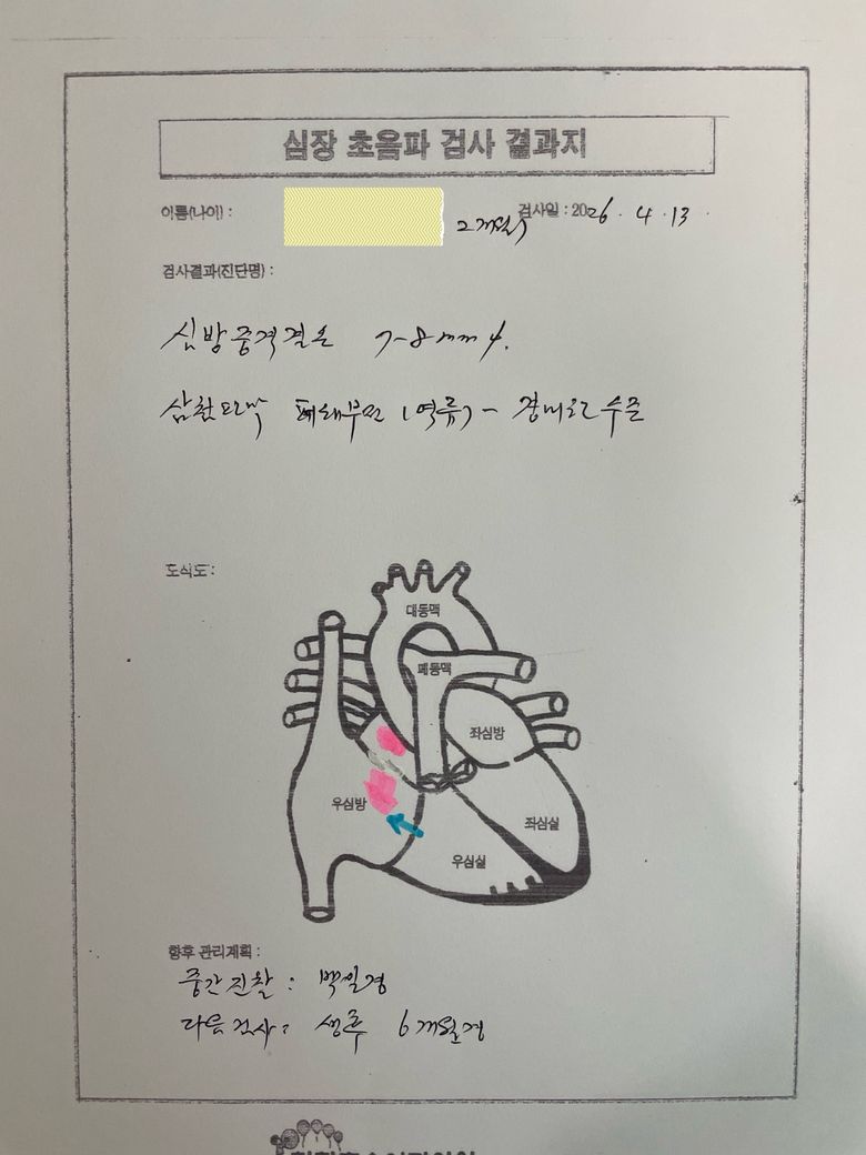 병태생리를 보면 좌심방에서 우심방으로 혈류가 넘어가면서 폐혈류가 증가하고 우심실 부하가 생깁니다. 이 부하가 지속되면 호흡이 빠르거나, 수유 시 피로, 체중 증가 지연 등의 형태로 나타날 수 있습니다. 하지만 현재 연령에서 증상이 없다면 급히 처치할 상황은 아닌 경우가 많고, 일정 기간 추적 관찰 후 치료 시점을 결정합니다.