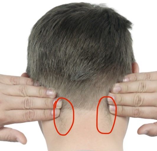 근데 며칠 전부터 머리 바로 아래 움푹 파인 부분이 뻐근하고 불편한 통증이 있고, 왼쪽 귀 밑 턱도 불편합니다 ㅜㅜ (사진 2장 빨간 동그라미)