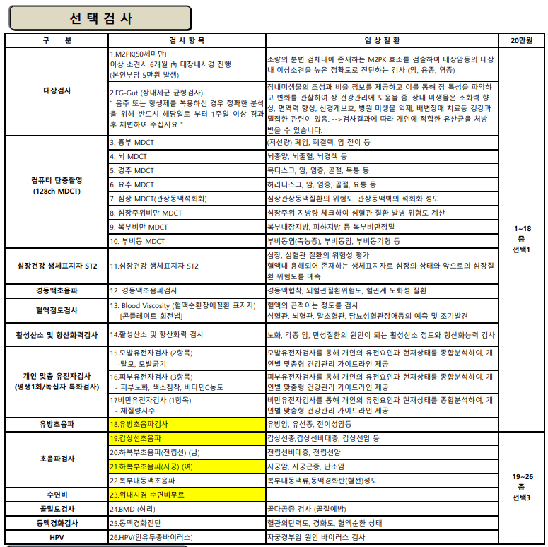 회사에서 건강검진받으라고 하시는데 선택검사 항목이 있더라구요 (회사 건강검진 검사항목을 아래에 첨부합니다).