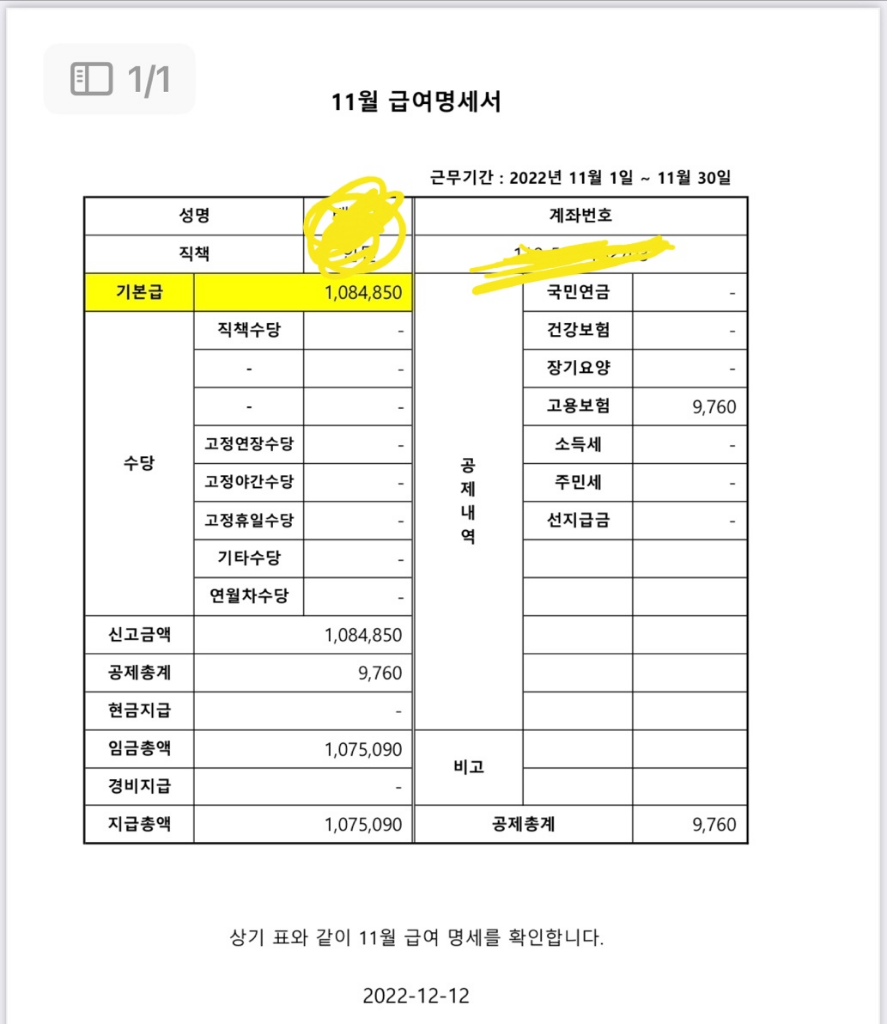 1. 2022년 11월 14일자로 입사하였고 최저급여로 계약함