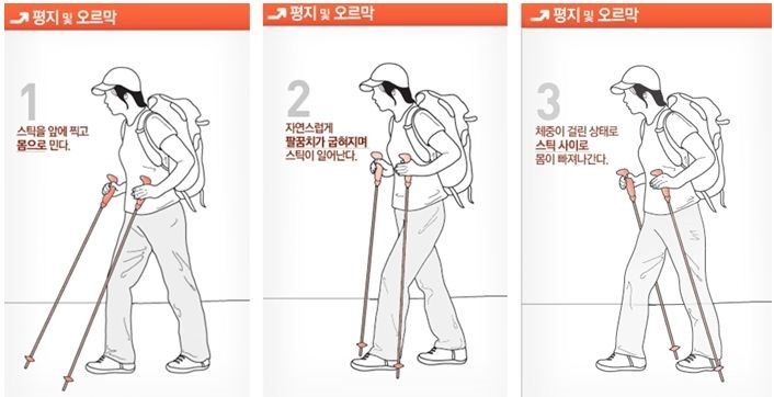 등산스틱은 기본적으로 평지 산행시 팔꿈치 높이로 하고 경사지를 오를때는 조금 짧게