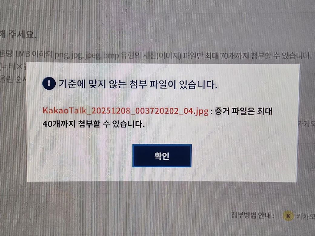 증거자료 첨부 파일은 용량 1MB 이하의 png, jpg, jpeg, bmp 유형의 사진(이미지) 파일만 최대 70개까지 첨부할 수 있습니다.