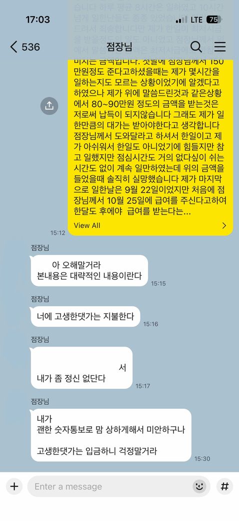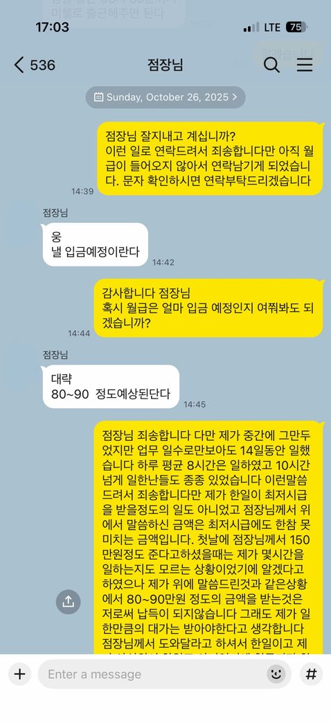 일을 시작하는 첫날 점장님께서는 9월 한달동안 일하고 150으로 주신다고하셨습니다. 이때 급여를 10월 25일 줘도 되겠냐고 하셔서 저는 나름의 배려라고 생각하고 알겠다고 하였습니다. 제가 23년도에 분류알바를 할 당시에 한달 기준으로 월~토 근무(하루 2-3시간)정도에 세후 113만 5천원정도를 받았기에 150이면 이번에는 전에 분류알바때보다는 조금 더 일하겠구나 생각하고 알겠다고 하였습니다. 하지만 저는 하루평균 8시간넘게 일하였고 10시간 넘게 일하는 날들도 종종 있었습니다. 그래서 저는 점장님께서 이렇게 오래 일시킬줄 모르시고 ’150이라고 생각하셨나보다 더 주시겠지‘ 생각하고 계속 일했습니다.(참고로 출근시간과 퇴근시간, 출근장소도 인정해주셔서 매일아침 출근 30분~1시간전에 전화로 ’어디로 몇시까지 와라‘라고하시면 그때 출근하고 일이 다끝나면 퇴근