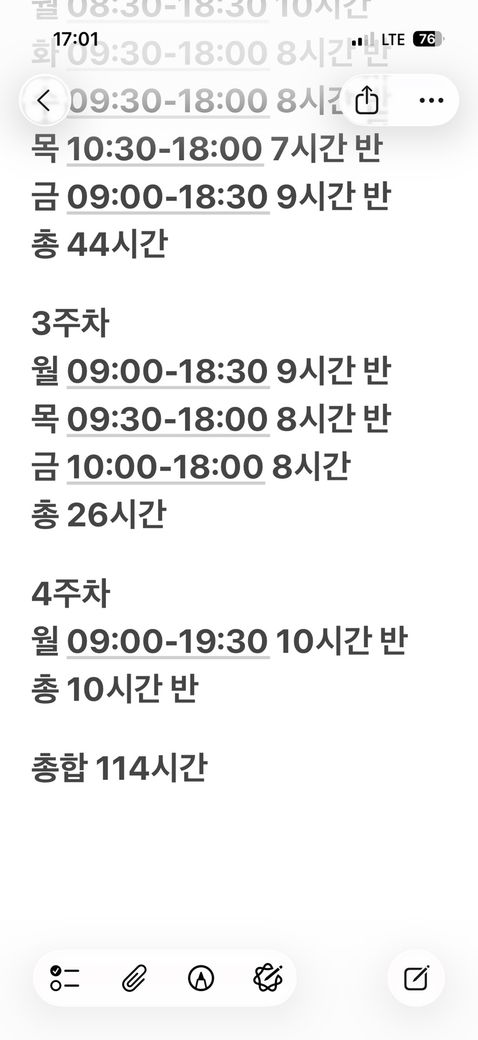 참고로 저는 22일까지 114시간정도 일하였습니다. 따로 공식적으로 기록을 하진 않았지만 제가 출근, 퇴근할때마다 핸드폰에 기록을 해놓았습니다(택배 차량 블랙박스로 일한 시간 확인 가능)