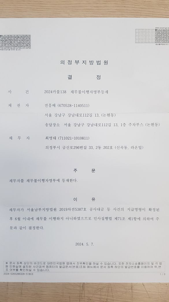 그런데 법원에서 채무불이행 이라고 통지서가 왔네요