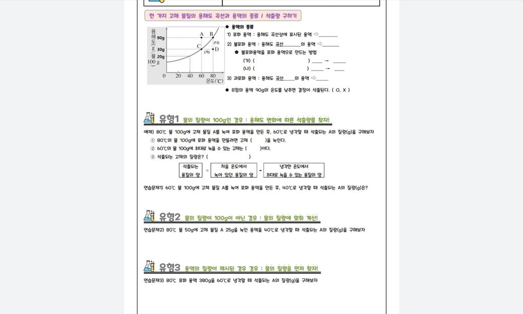 학교에서 추가 자료를 줬는데, 유형1,2,3답이랑 설명 좀 부탁드립니다. 잘 이해가 안되서요. 중 2 2학기 용해도 문제이고, 수행평가 관련이라 답해주시면 감사하겠습니다