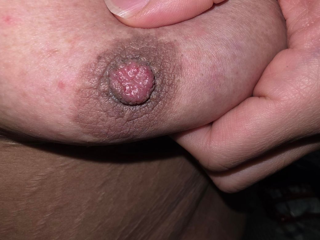 사진에서 보이는 병변은 정상적인 젖꼭지 형태라기보다 표면이 울퉁불퉁하게 증식된 결절 형태로 보이며, 통증과 함께 투명하거나 혈액이 섞인 분비물이 나오는 점은 단순 마찰성 상처만으로 설명되기 어렵습니다. 특히 남성에서 젖꼭지 부위에 지속적인 통증, 진물, 출혈이 동반되는 병변은 단순 피부염 외에 몇 가지 질환을 감별해야 합니다.