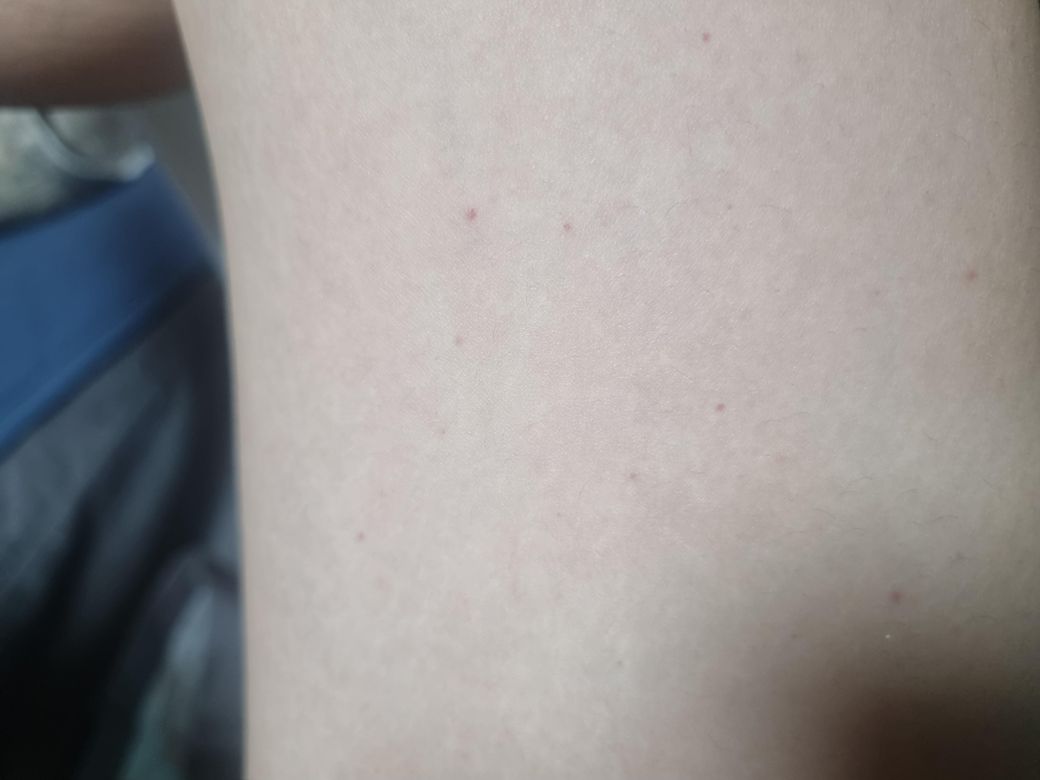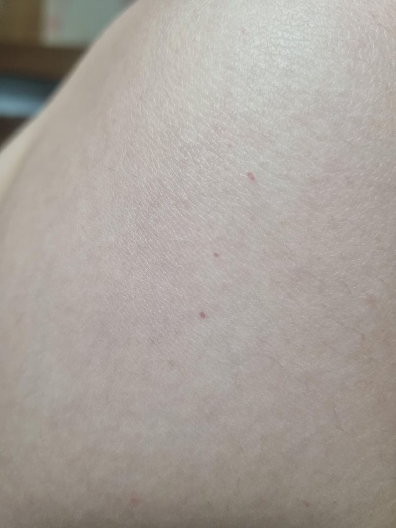 오늘 허벅지 한번 보니까 갑자기 빨간 점들이 생겨있었어요.. 원해 이런거 없었던거같은데 갑자기 생겼구요 아프지도 않고 별 느낌 안들어요 이게 뭘까요...? 위험한건가요..??