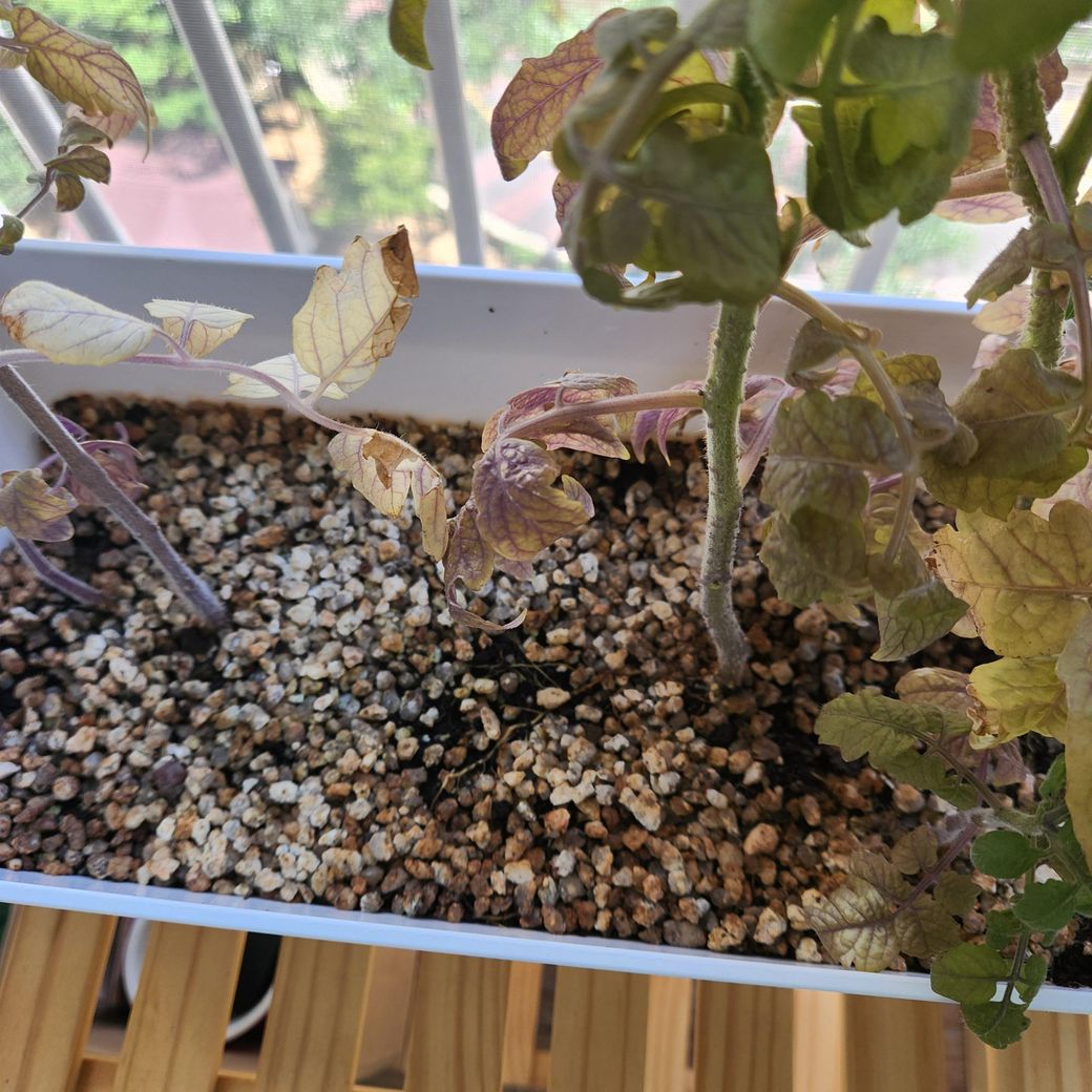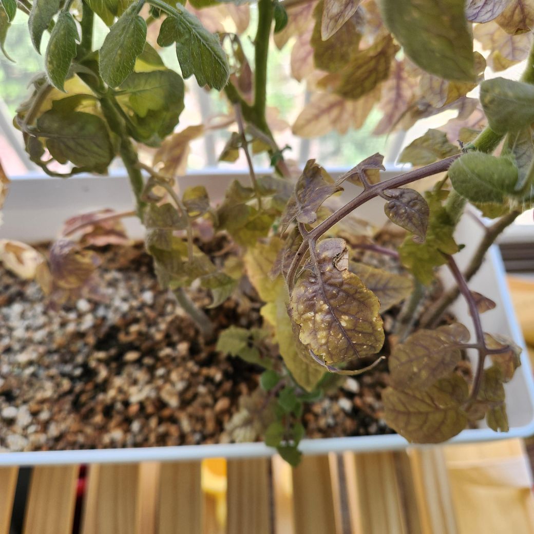 지금 많이 아픈 상태입니다 영양소가 물을 꾸준히 주어서 다시 건강에 회복하게 하도록 하는 방법이 제일 좋습니다 안 그러면 토마토는 생명을 다한 것입니다