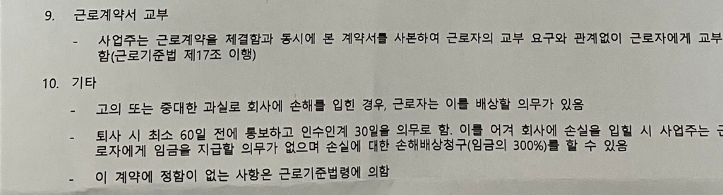 위 손해배상 약정은 근로계약서에 규정되어 있으나 그 내용은 근로기준법에 정면으로 반하는 내용이기 때문에 이에 대해서는 해당 조문은 무효로 보아야 할 것입니다. 그러므로 이는 무효인 조문으로 이에 근거하여 손해배상 청구를 할 수는 없고 역시 이를 이유로 임금을 지급하지 않을 수 없습니다. 참고가 되길 바랍니다.
