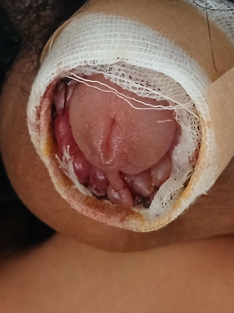 수술 및 봉합 후 부종에 의해서 사진처럼 부을 수 있습니다. 봉합한 부위는 압력에 의해서 짜부러들어있어서 볼록볼록하게 보이는거죠.