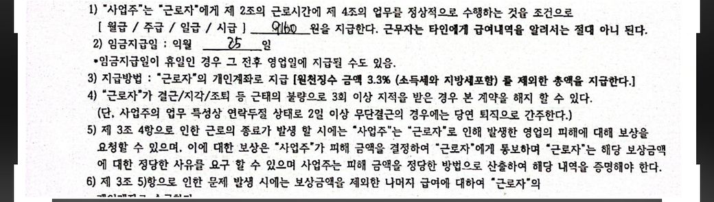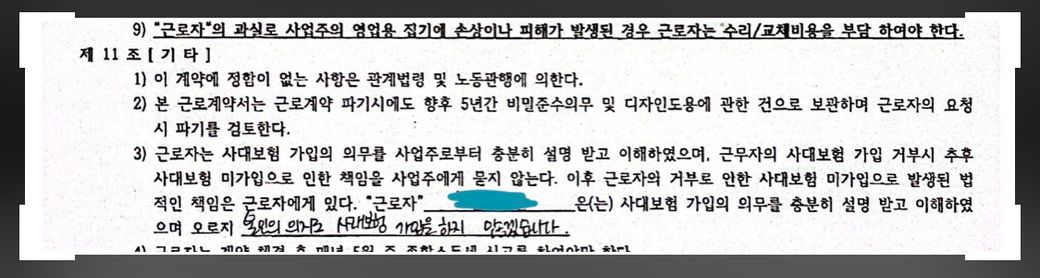 * 근로계약서상 4대 보험은 본인 의지대로 가입하지 않는다는 조건에 동의함.