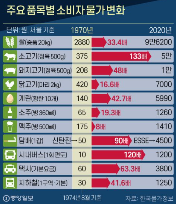 중앙일보에서 보면 지난 70년대 이후 50년간 가장 많이 상승한 소비자물가는 소고기로서 133배가 상승했다고 해요