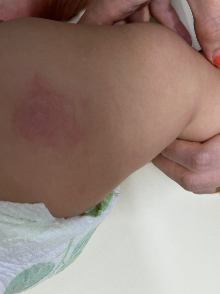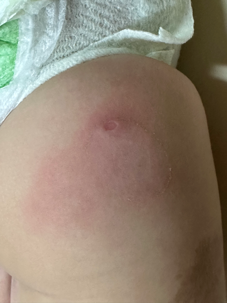 아이가 접종받은 후 국소적인 염증반응이 심했거나 감염증이 발생했을 가능성, 혹은 알레르기반응을 보였을 가능성이 있겠습니다. 아마 붉어진 부분이 화끈거릴 것 같은데, 그렇다면 소아과를 방문해 진찰받아보시는 것이 안전합니다.