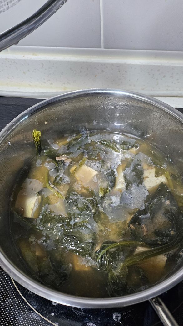 시금치 된장찌개입니다. 시금치, 두부, 된장, 국간장 정도만 들어갔고 만든지 하루 지났는데 흰색막 같은게 생겼어요. 이거 곰팡이일까요???