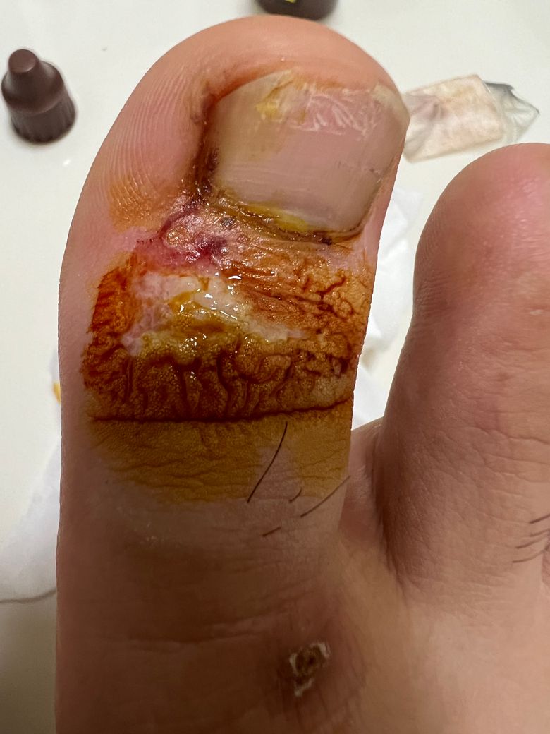 주변에 피부가 쭈글쭈글한걸 보니 혹시나 드레싱 용품을 붙여놓은 상태로 물이 안에 들어가는 상황을 만드는건 아닌지 잘 생각해보십시오.