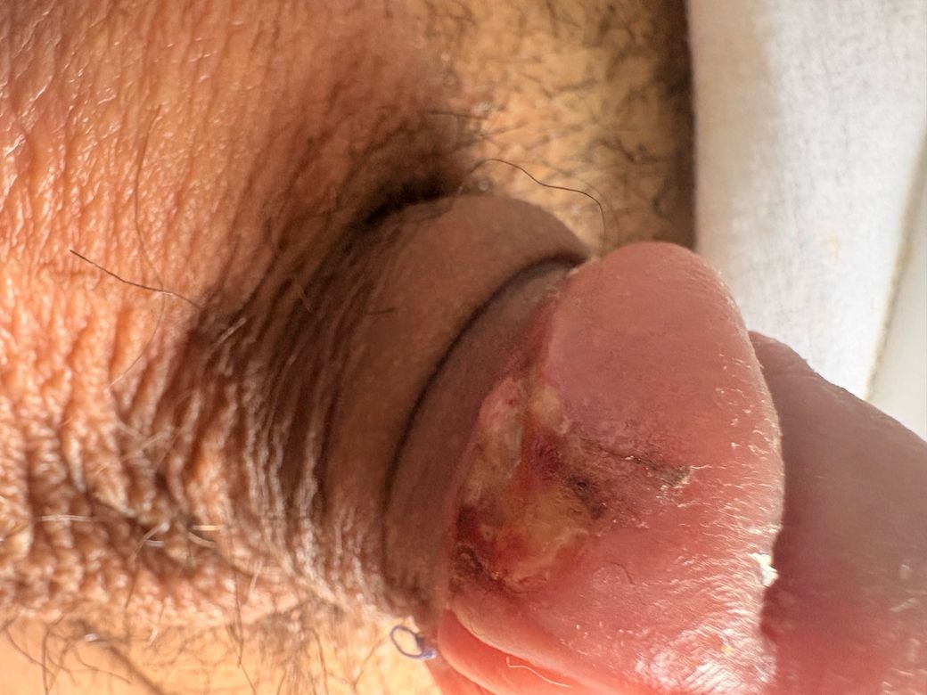 포경수술 후 11일 시점이라면 아직 상처 치유가 진행되는 시기입니다. 일반적으로 수술 후 약 2주 정도까지는 부종, 약간의 삼출액(맑거나 약간 노란 액체), 딱지 형성 등이 나타날 수 있습니다. 사진에서 보이는 부위는 봉합 부위 주변에 상처가 아직 완전히 상피화되지 않은 상태로 보이며, 노란색 분비물은 초기 상처 치유 과정에서 나타나는 섬유소성 삼출물일 가능성이 있습니다. 이 자체만으로 즉시 감염을 의미하는 것은 아닙니다.